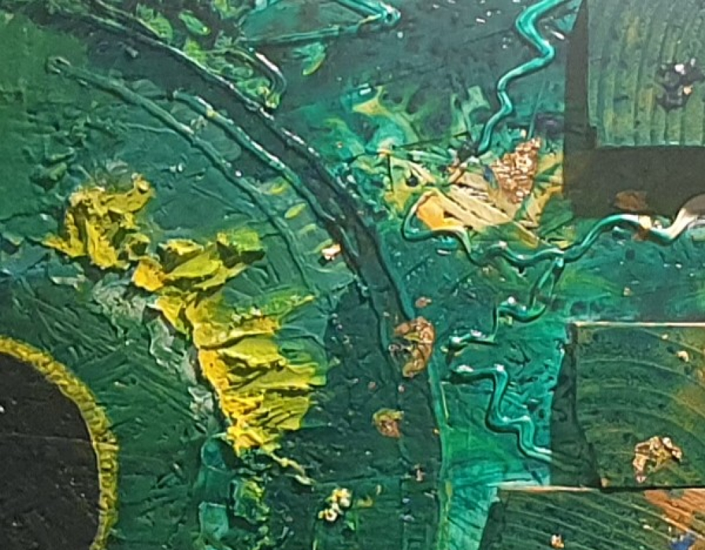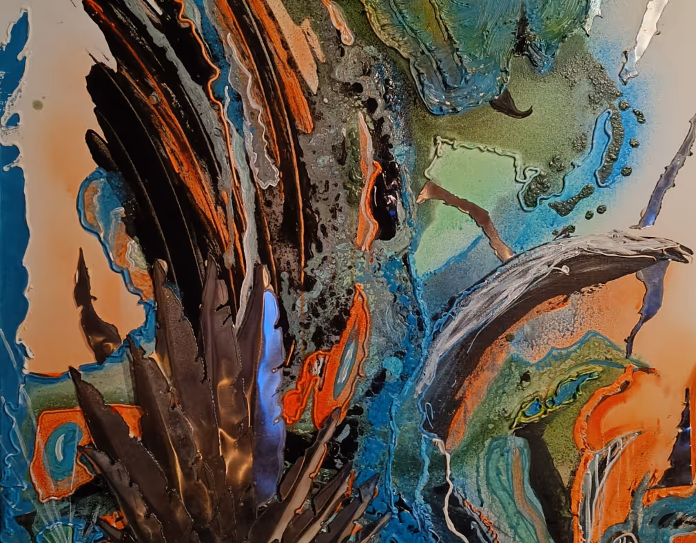 Artist statement: Dit werk is ontstaan als een groeischilderij. De abstracte vormen en stromende lijnen verwijzen naar groei, verandering en het samenspel tussen controle en loslaten. Oude lagen blijven zichtbaar en geven het werk diepte en een gevoel van tijd. Het schilderij nodigt uit om steeds opnieuw te kijken en eigen associaties te ontdekken.“Door de rustige maar gelaagde uitstraling is dit werk geschikt voor ruimtes waar aandacht en verstilling samenkomen, zoals kantoren, ontvangstruimtes en praktijken.”